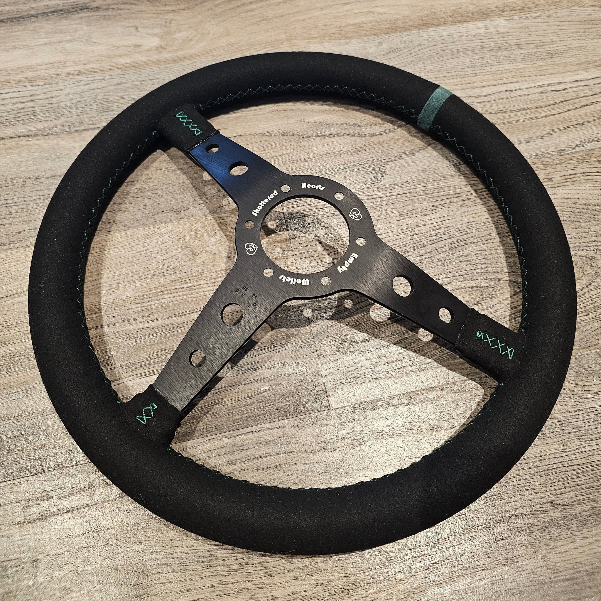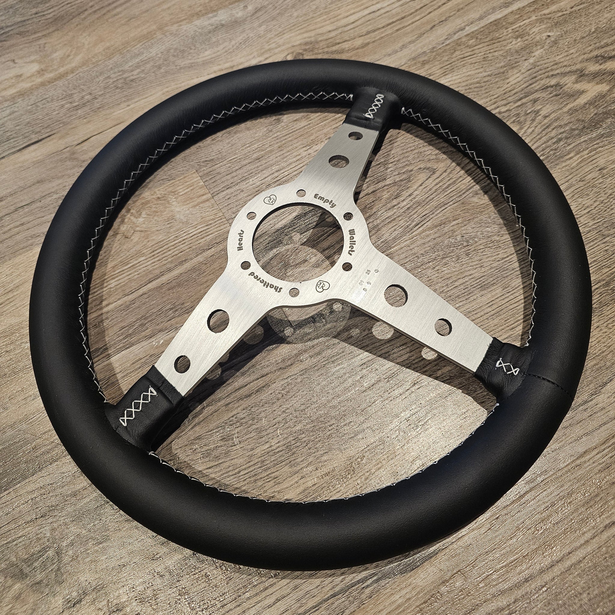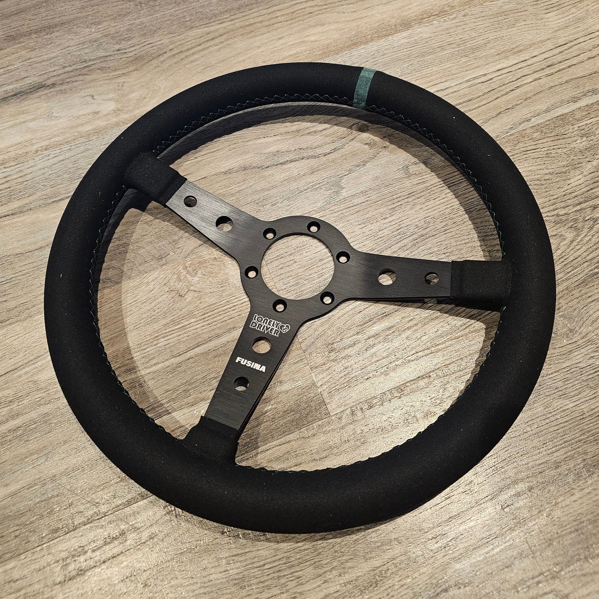 A collaborative project with our friends in Italy. Like a fine Italian suit, these wheels can be customized to your car. Spoke color, handle material, handle color, and stitch color.